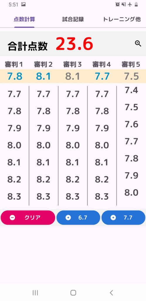 点数は画面上で入力する必要がなく一覧をスライドして選択するだけですので、審判の点数発表に合わせて素早く計算する事が出来ます。