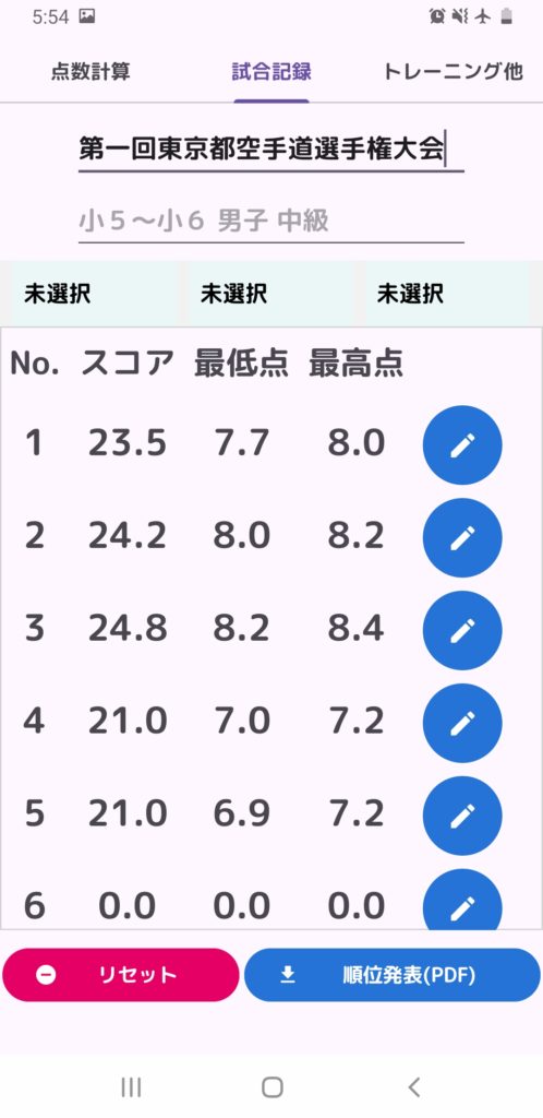 今まで時間がかかっていた点数の計算や確認が自動で出来るため、空手の形試合をスムーズに進行する事が出来ます。